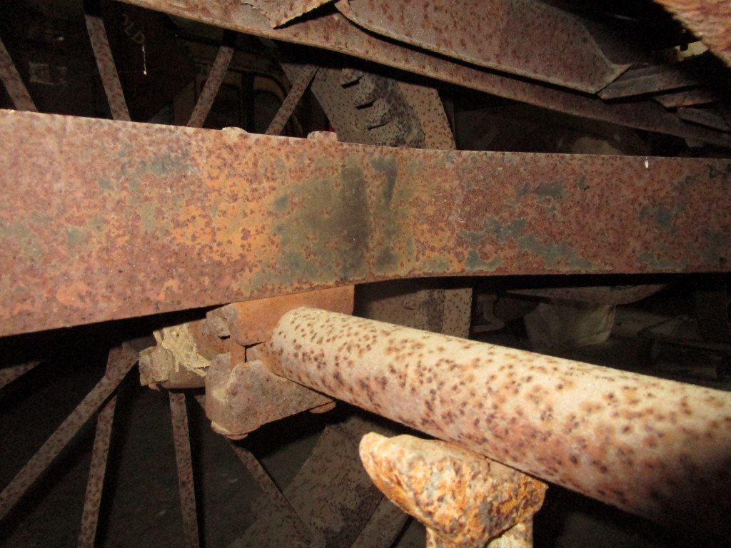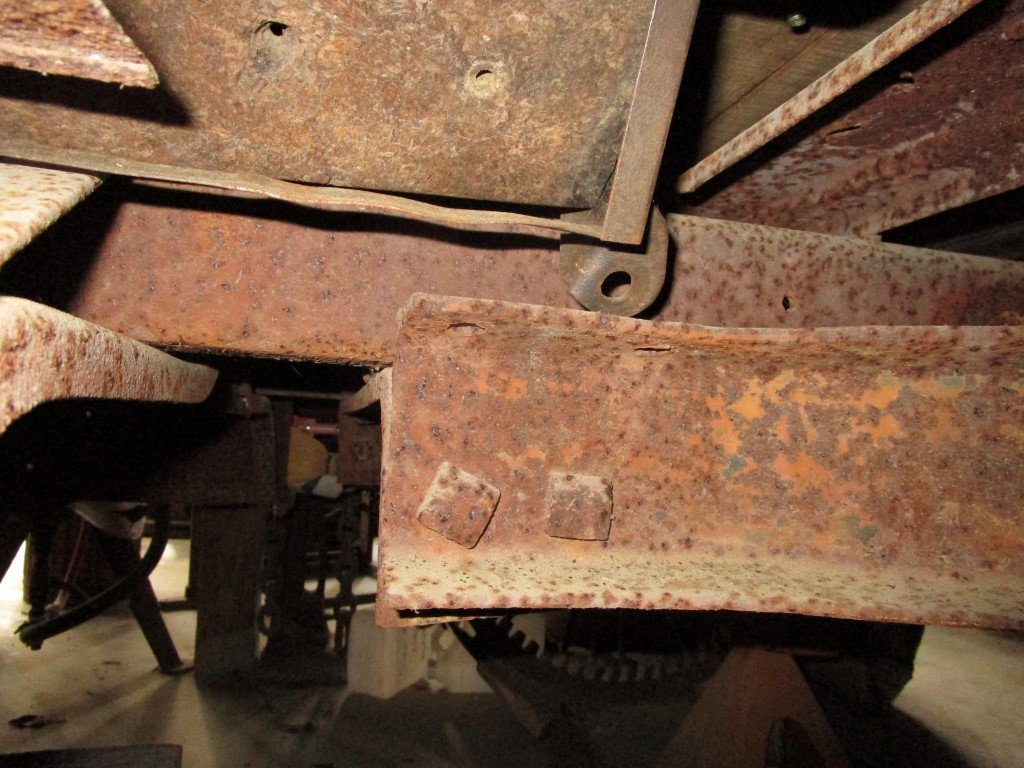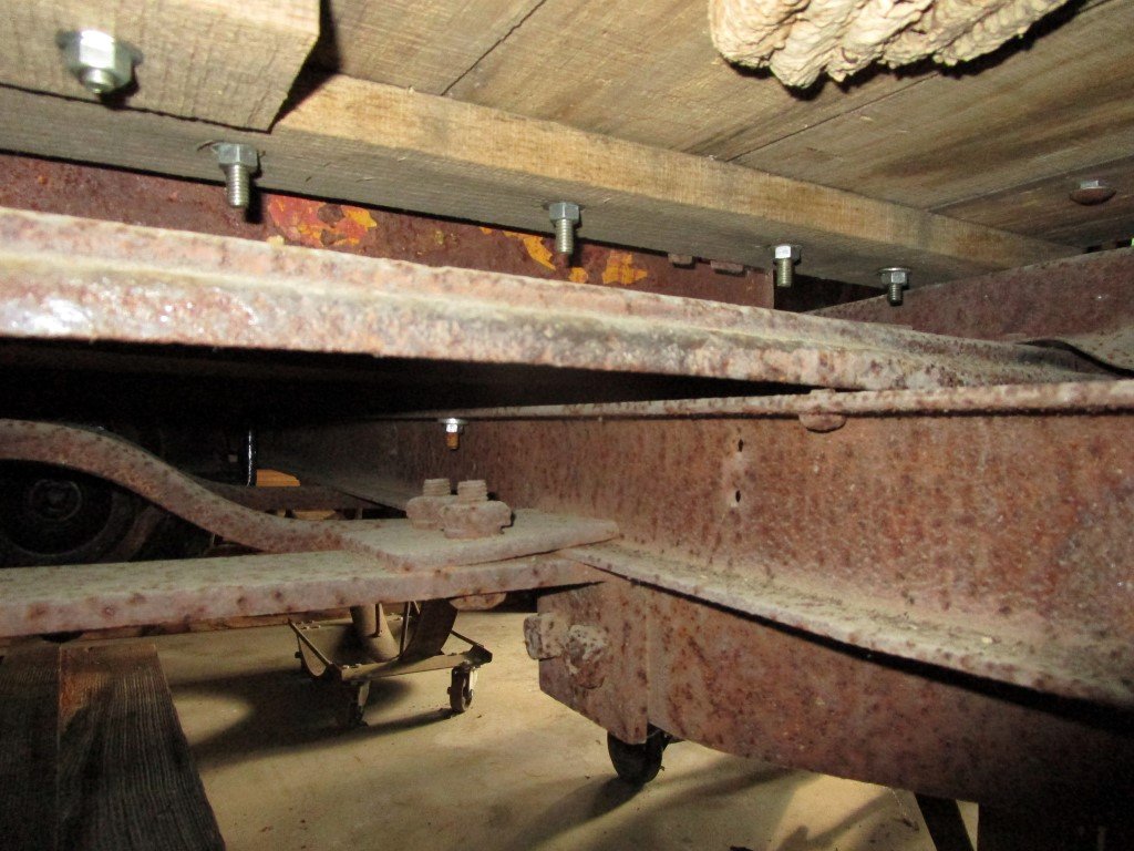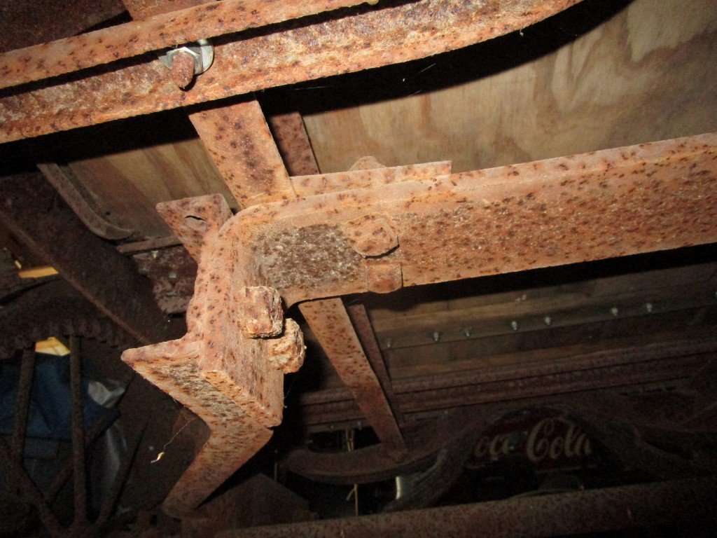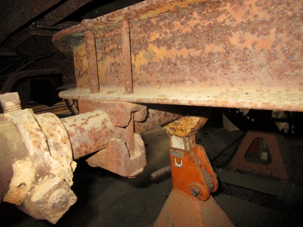 Here are some photos of my tractor conversion mounting points. It looks like some of mine may be mounted a little different than yours. Hard for me to tell from your photos. Maybe some different parts or how a different farmer did it ????? My drive shaft and rear axle assembly is out because I rebuilt my rear axle and have not put it back in yet. I did hold a torque tube in position and sight it to the centerline of the axle housing mounting clamp holes and it looks like I have about 1 inch of clearance between the torque tube and the tractor rear wheels axle. I had never looked real close at how the conversion bolted to the frame. It appears that the rear spring and torque tube is all that keeps the assembly from being ripped out of the tractor by the plow hooked to the draw bar. ?? The front of the conversion is only held in place by a "pinch plate" clamping it to the frame rail. When you look at my photos let me know if you see any major differences.