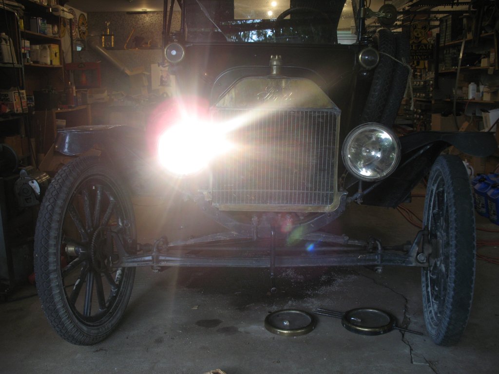 From reading Model T lore you might think magneto headlamps burn out at a furious rate. But when I had a bulb go out last week that pair had been in the car for at least three years. I don't do much night driving, but I seldom shut off the lights. When the car is running the lights are on.