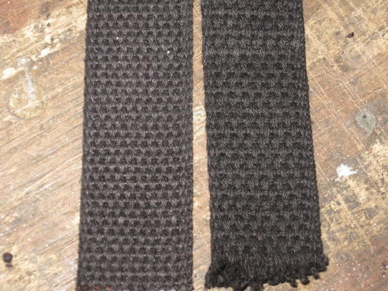 The hardest part was finding the correct webbing. Most all of the cotton webbing that is sold is more fashion-over-function: too thin (0.075" +/-0.005 vs. 0.108" +/-0.005) and not as tight of a weave. A genuine military web belt is the right thickness, but wrong width, you need a 6L webbing, 1" wide. Thicker and tighter weave, 6L on the left and the thinner webbing on the right.