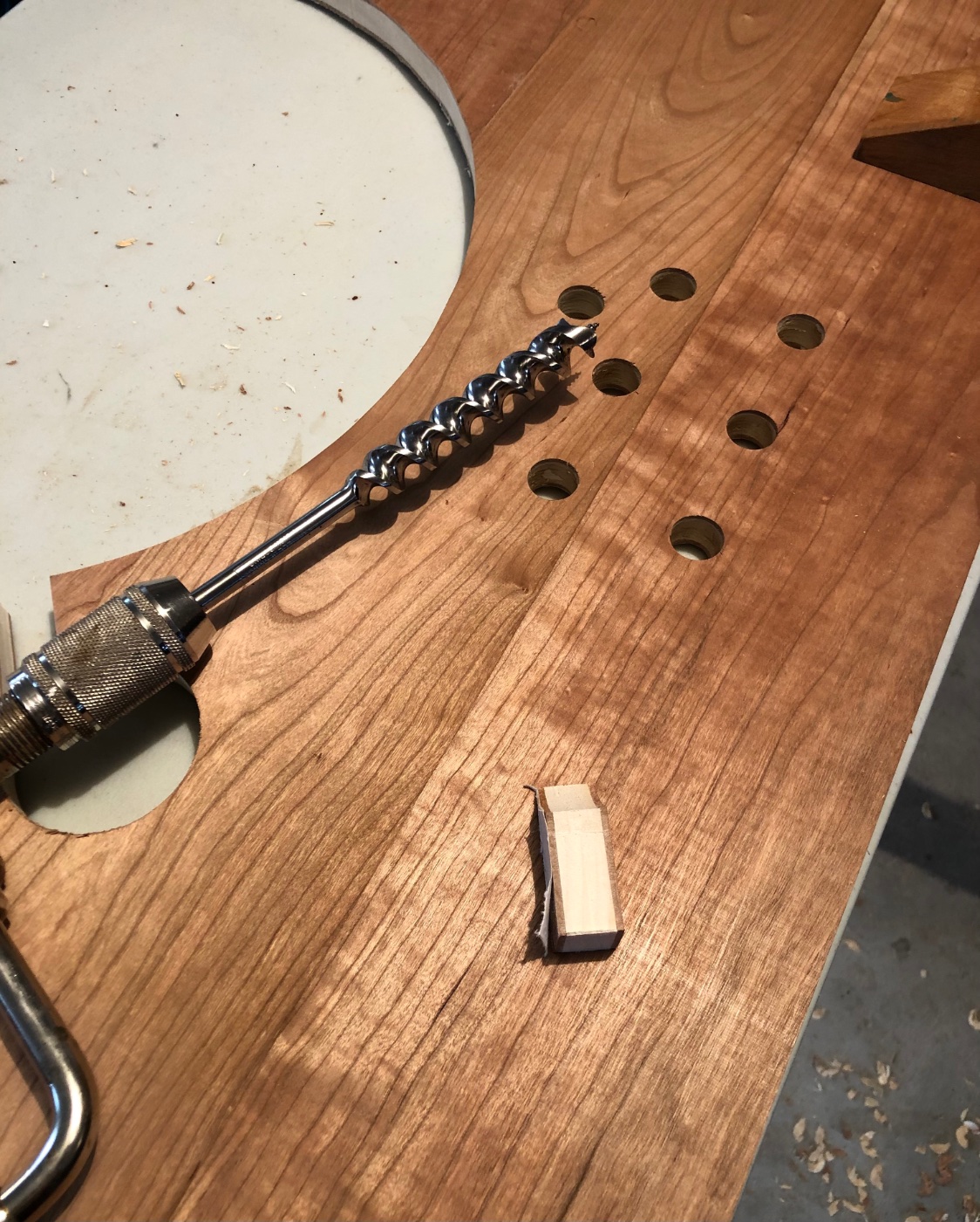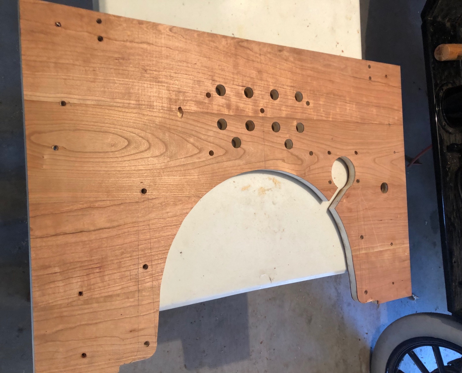 Interesting to note the differences between specific production years. I will certainly want to be sure of pattern accuracy before cutting the panel blank. Right now, I believe what I've found to be correct dimensions for the panel makeup - the core is laminated in vertical strips 5/8" thick, with cherry cross plies front and back of 1/16" thickness, yielding a completed panel 3/4" thick.
