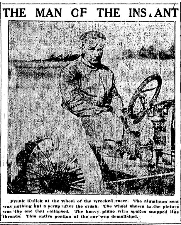 The "Detroit News" also carried the story, with a photo of Frank Kulick seated on the racer, and of the wreck: