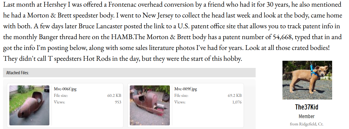 JSteele wrote: ↑Tue Oct 24, 2023 1:27 pmLarry Sigworth thought this is probably an original Morten & Brett Radiator shell. Museum of American Speed has has a M&B Speedway which I looked over closely and took some measurements off of but it's been 15 or 16 years since I did that. It has a correct radiator shell, but I don't know if it's original and don't remember the fine details. My brain absorbed everything back then, but now it will not release that information, should have wrote more down and taken better pictures.
