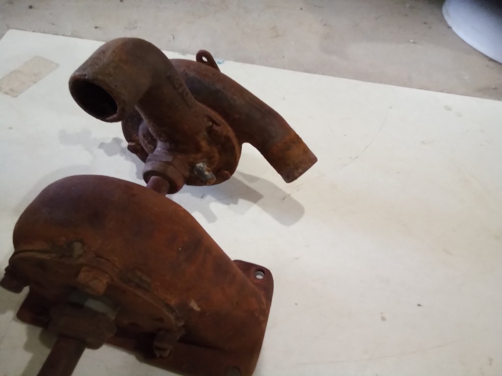 was digging around thru my parts and found this Dodge Brothers water pump ... this is the style i am looking at to use on the Mcmillon head i purchased last year ... a simple pump that rotates clockwise as viewed from the front ... the shaft is 5/8" diameter and driven at crankshaft speed for the DB engine ... the mount is 2 bolt thru the angle plate cast in pump base ... these work well on the DB engines ... i have had 7 DB cars and all ran very well and never had problems with running hot even in our sometime 3 digit temps. ... the impeller is cast bronze , the pump body is thick enough to re-tap the bolt holes for the inlet to position as needed ... hope this helps ...always an optimist ...Gene French