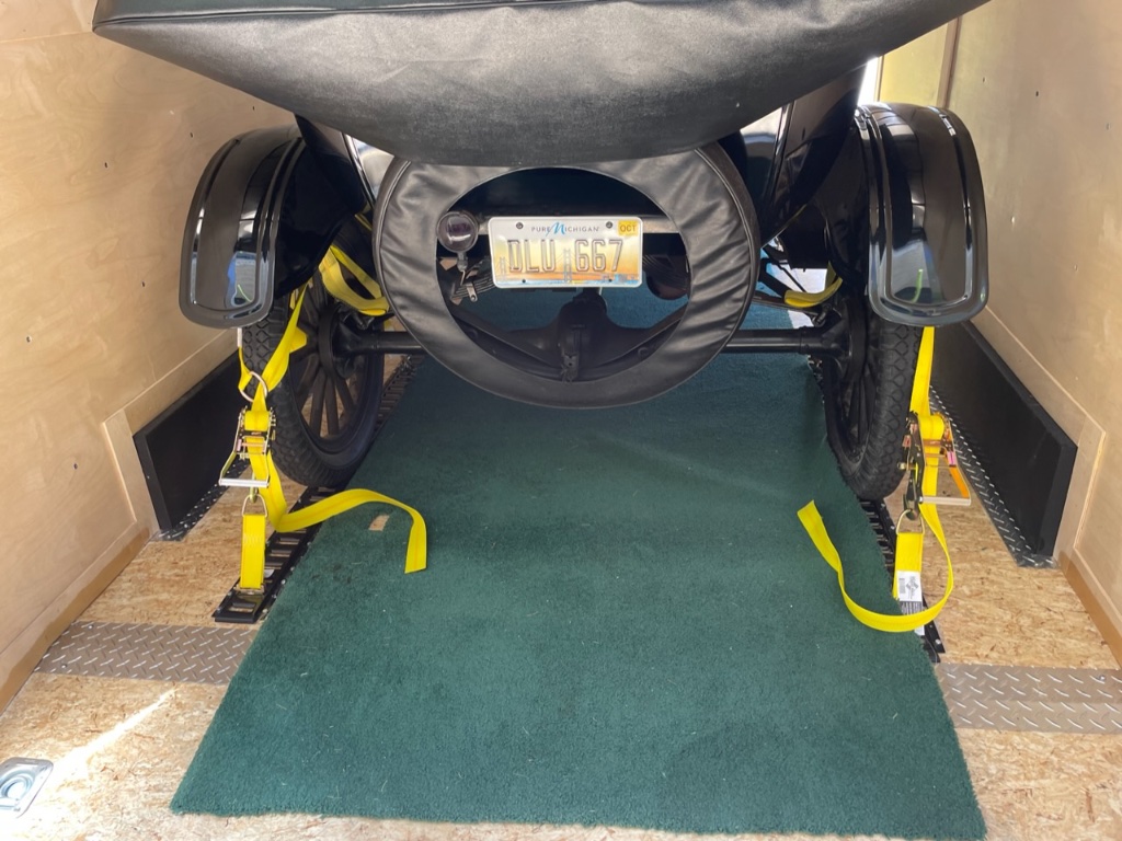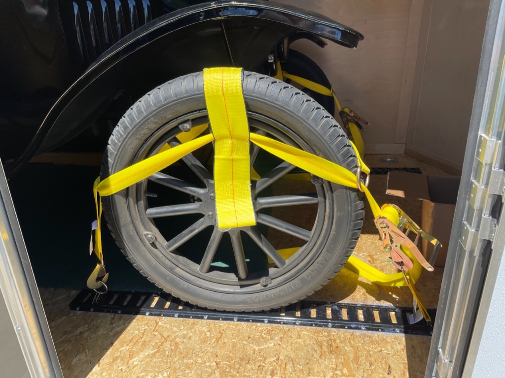 Miles- That's exactly the way I tie down Model T's in my enclosed trailer. My reasoning in setting up my trailer with e-track and nylon basket-type tie downs is that THAT'S THE WAY ALL RAILROADS SHIP NEW AUTOMOBILES, and I honestly believe that railroads have found it to be the best way! Additionally, I've found that a good way to store the basket type tie-down straps is to mount a standard 3 ft long length of e-track horizontally near the ceiling of the trailer and just hang them up where they are kept neat, out of the way, and not tangled up. FWIW,....harold
