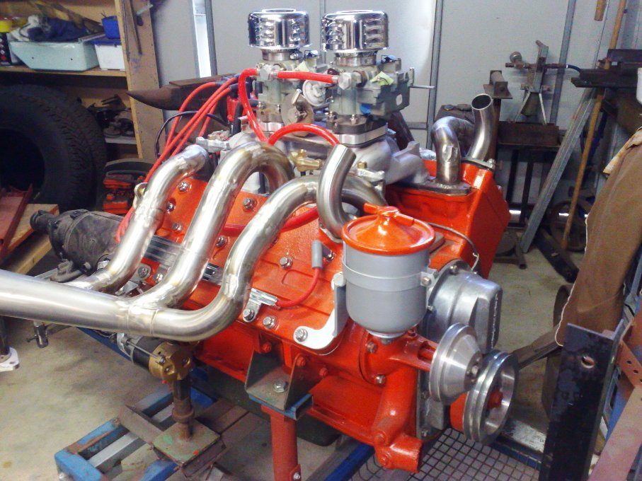 The engine runs power steering and a/c, twin thermostats, twin carbs and improved cam, HEI ignition and a dual homemade exhaust system.