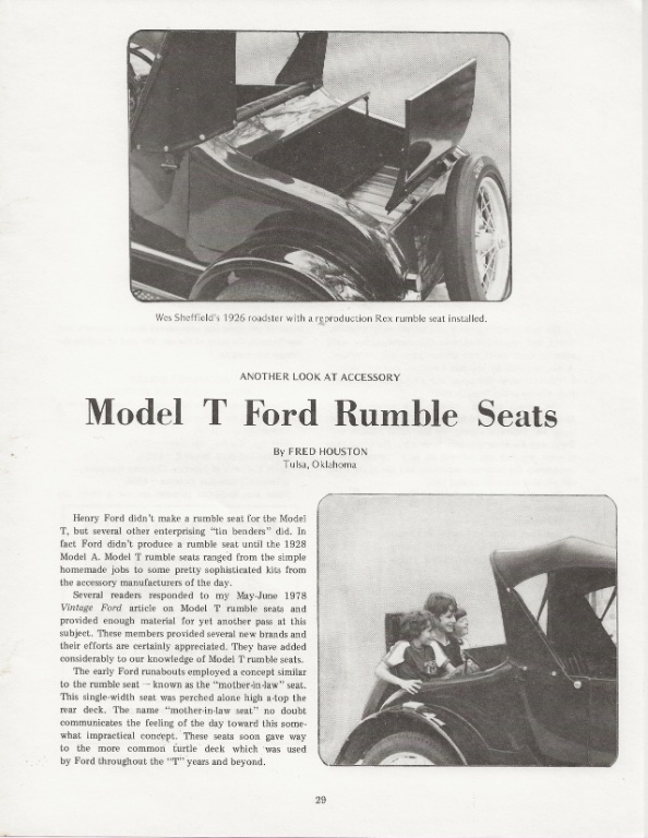 I have a 26 Roadster with a rumble seat. The rumble seat is not original equipment on the model T. The first Fords to have a rumble seat were Model A's. Someone who had this car before reversed the trunk lid and made it into a rumble seat. The upper part of the top was cut so that it could be opened or closed with the top down. I also cut my finger one time on a tour when it slammed down as I was reaching for a tool and spent a few hours in an ER getting it stitched back on. So now whenever I open it, I use a bungee cord to the spare tire.