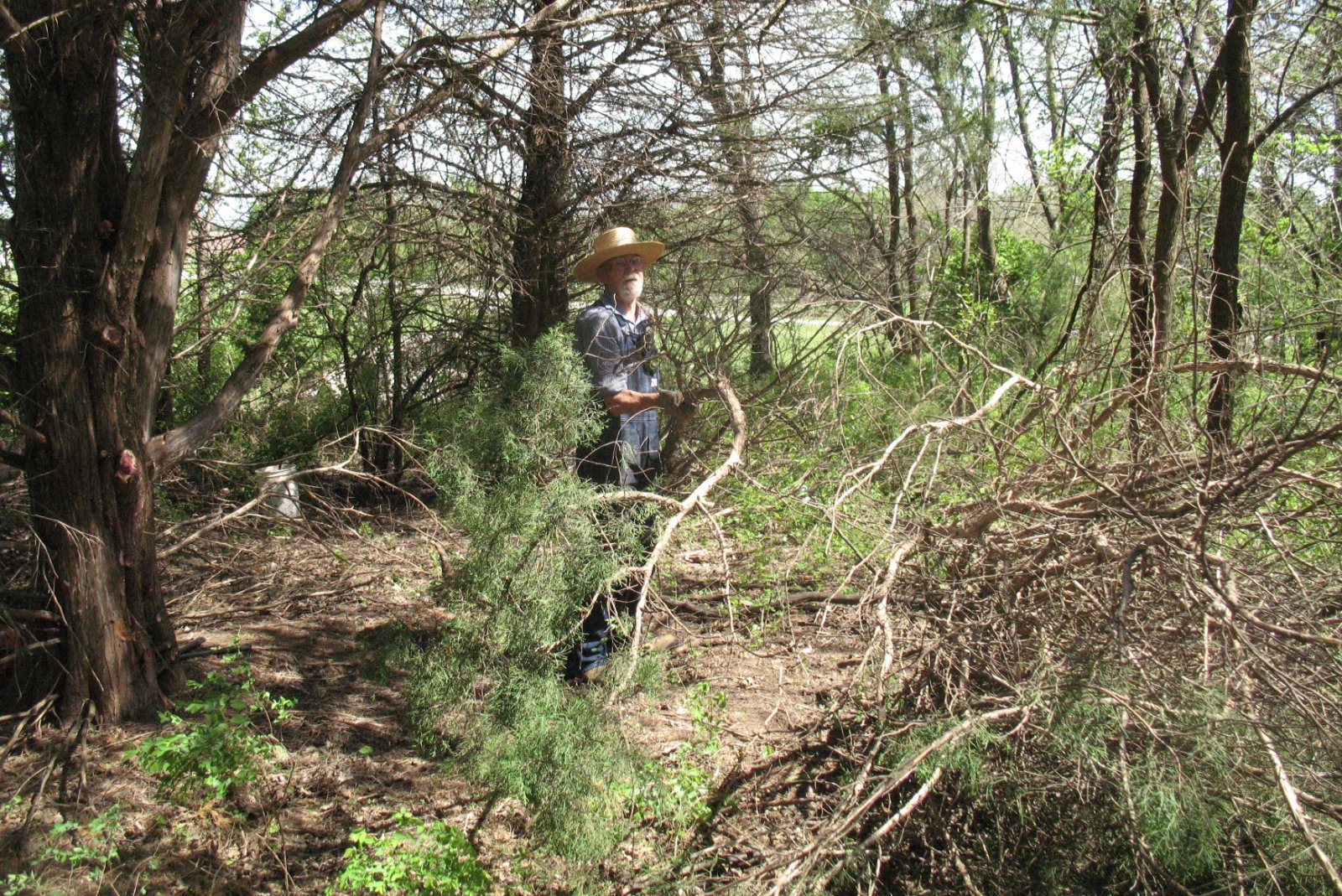 The other main vegetation I have to deal with is Osage orange, also known as bois d'arc, or just hedge. It's mighty hard stuff, and I had to sharpen my saw more than once. There were also a lot of little trees that were small enough for the clippers. The bottle is Tordon to kill the stumps.