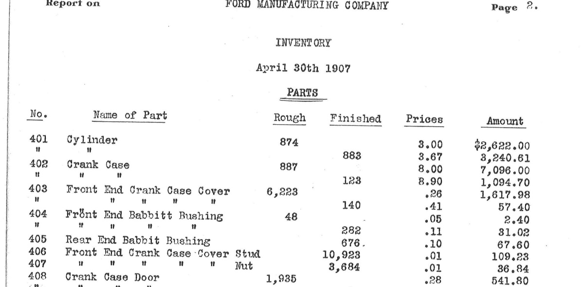 This link is to the April 30, 1907 Ford Manufacturing inventory account prepared by N A Hawkins as Manufacturing was negotiating with FMC for acquisition. All parts are listed and inventoried. Considering the size of the property, and number of rough and finished castings (cylinders), I doubt any foundry work was done there, only finish and assembly. At the time of the inventory there are almost 900 rough and 900 finished cylinders alone (2 cyl castings), enough for 900 cars when combined.