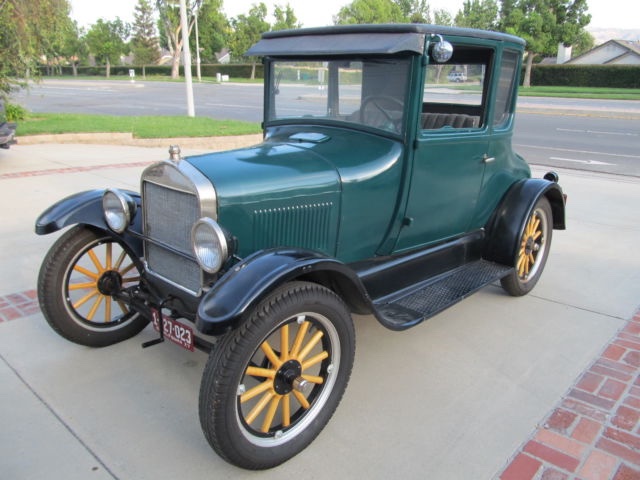 Period picture of a new green 1927 Model T coupe with its’ windshield frame painted the same color as the body…