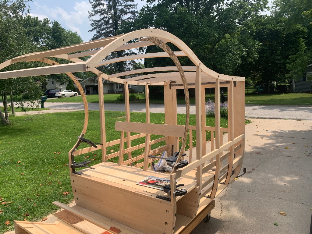 Finally got the roof rails cut out and got the top bows (9 of them) cut out and fastened. Next to finish will be the “C” sections, which will then finish the whole profile of the body. Getting closer!