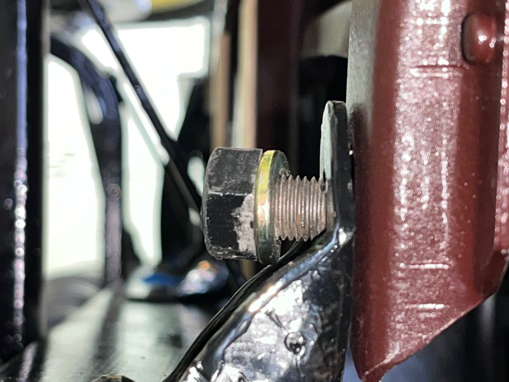 I raised the body enough to get the bolts into the bracket (photos 1 and 2). This has required two washers on the left front frame support bracket (photos 3 and 4), and one washer on the adjacent body block (photo 5). In my next post, I will show how the body is setting now.