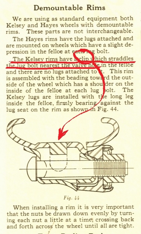 I would have expected all clincher rims would have fixed lugs by 1926. The Kelsey loose lug rims were used in the early 20's. Do your wheels have the depression in the inside diameter of the felloe, on which the loose lug rests? If not, Interchangeability then depends on the wheel manufacturer. Hayes rims had a foot on the lug which requires a depression in the felloe to accommodate the foot. Hayes rims will only fit Hayes wheels. Other brands of fixed lug rims did not have the foot on the lug. These will interchange between brands of wheels, including fitting Hayes wheels.