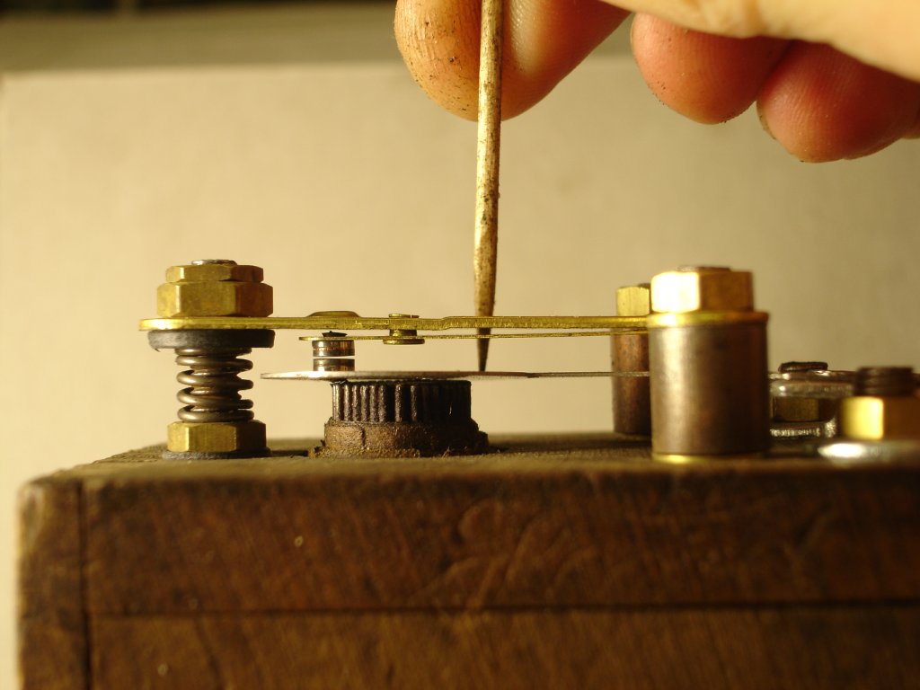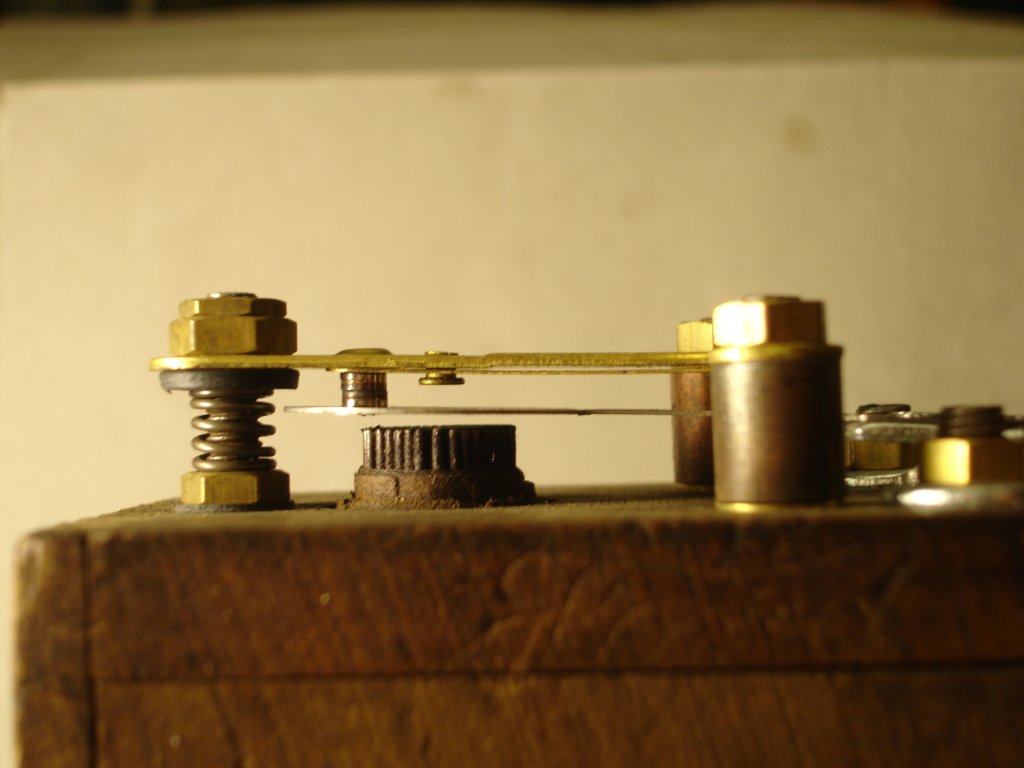 When the coil is at rest, the lower point must push the cushion spring up off its rivet head to touch the top piece. See photo