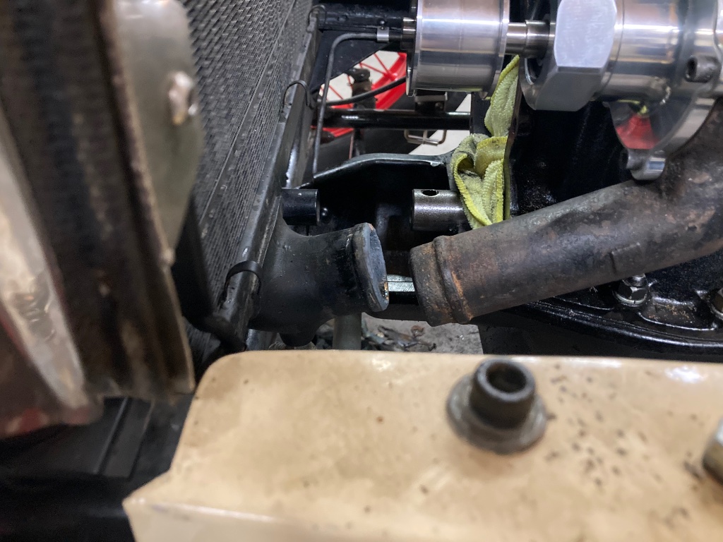 Of all the possible complications… the water pump inlet is more than 1/2” lower than the radiator neck! There is enough slop in the mounting bolts to get it within 1/4”… but the shaft becomes waaaay out of parallel with the crank pulley, and I fear never ending belt problems.