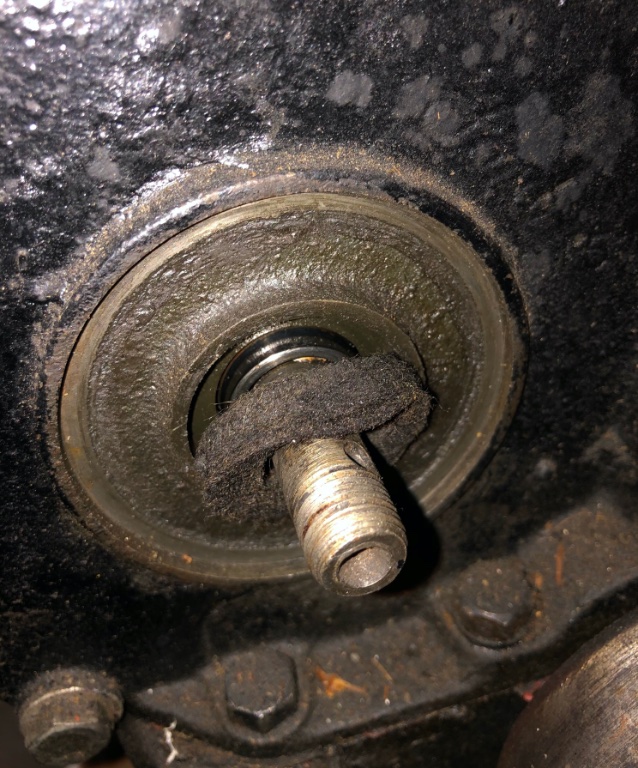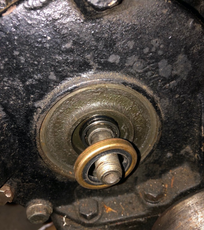 I assume the dished aluminum plate is meant to deflect oil that leaks from the seal on the cam shaft? The center hole is a little chewed up.