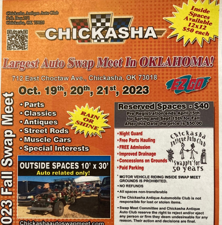 But I think this would be a good time for the Chickasha car groups to reschedule when their swap meets are. But would that happen? I would hope they would try but I don’t think so. There are other things going on at those grounds besides old car swap meets and everybody wants their piece of the pie but they’re only so much to pass around.