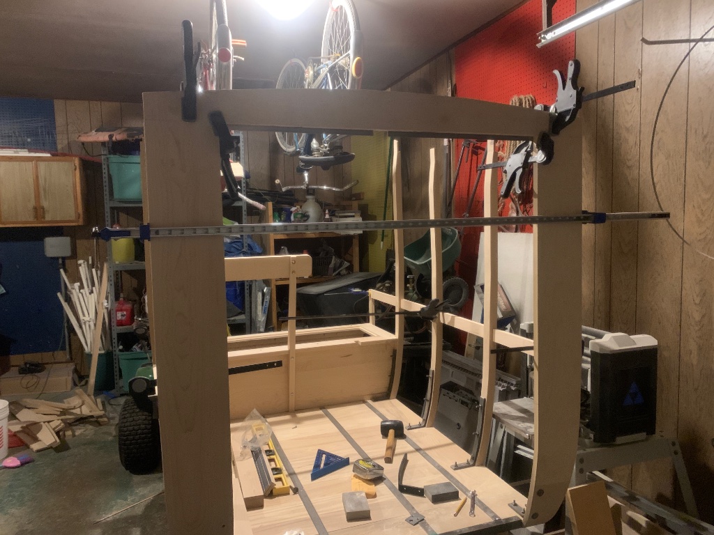 Finally got the roof rails cut out and got the top bows (9 of them) cut out and fastened. Next to finish will be the “C” sections, which will then finish the whole profile of the body. Getting closer!
