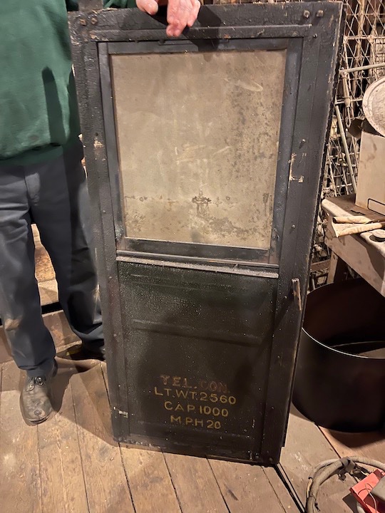My brother found this in the attic of his garage in Waltham MA. It's a door to a truck that seems to have wheels on the top that went into a track? Any ideas or are there way too many home built cabs out there?