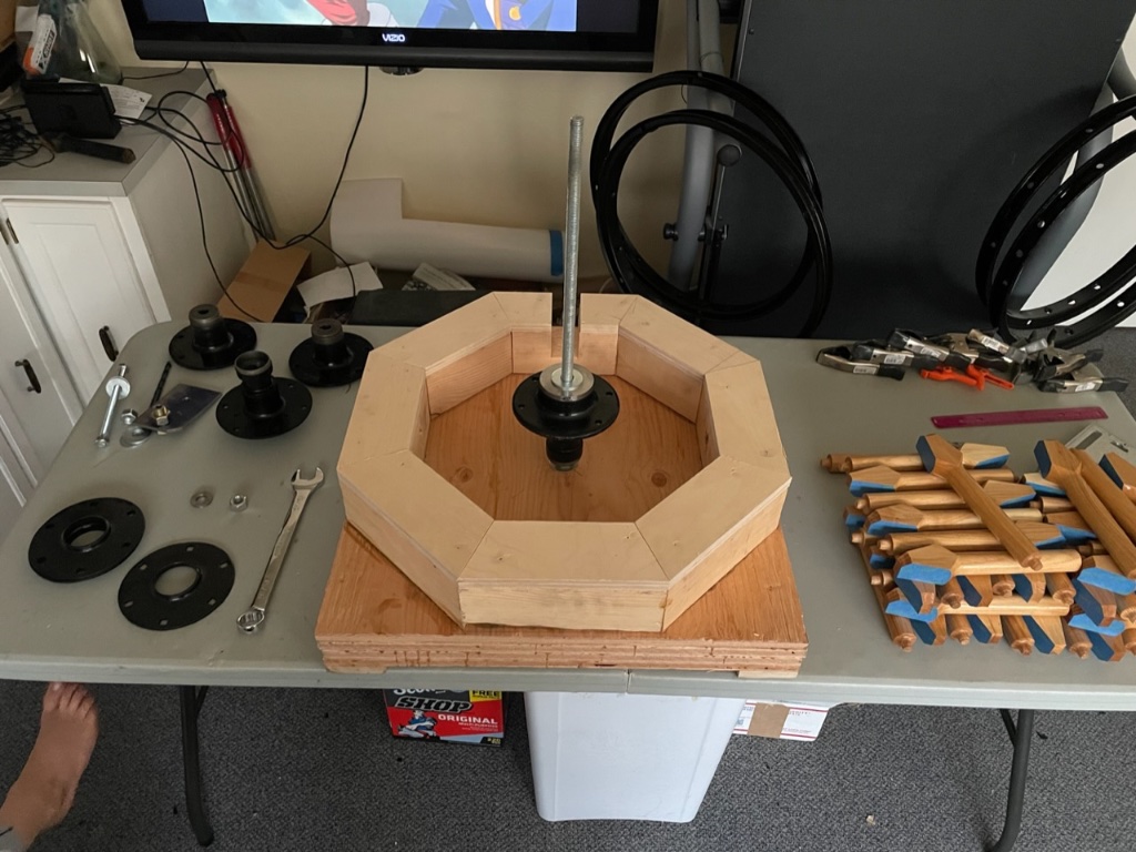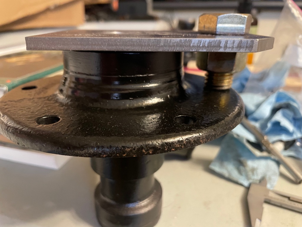 Another angle of the drilling jig. It was held on by a 7 inch long 1/2 bolt through the hub.