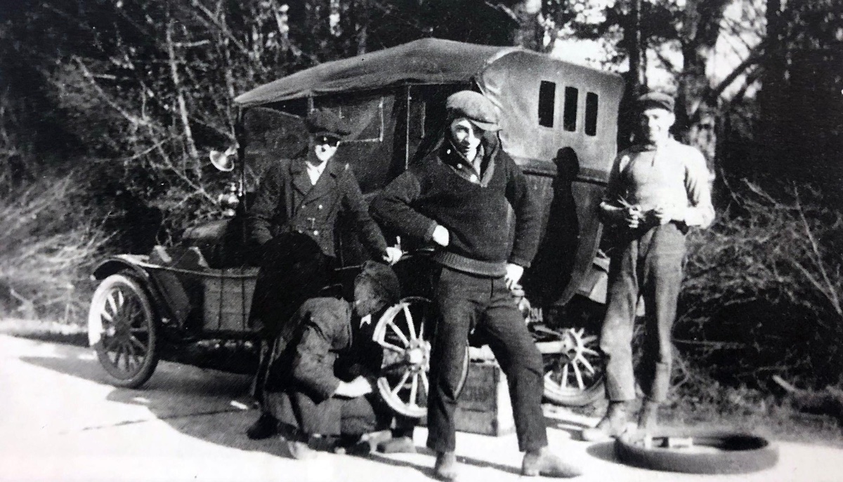 No date, place or identification of the guys in the photo, just something I stumbled onto perusing the "winternet". It was presented as being from the era, which is totally believable on all counts. Looks like one of probably many flats five guys encountered on the road, "staged" as they took the opportunity to clown around for the camera while their pal did the hard work !