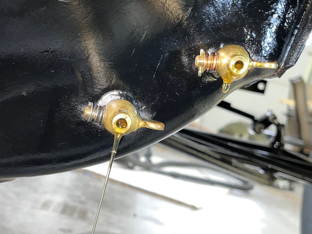 I haven't started my restored engine yet. I put four and half quarts of oil in it several weeks ago. I left the top petcock open, and I stopped putting oil in when I first saw oil starting to come out of it. I recently noticed oil seeping out of that petcock, so I replaced it yesterday.