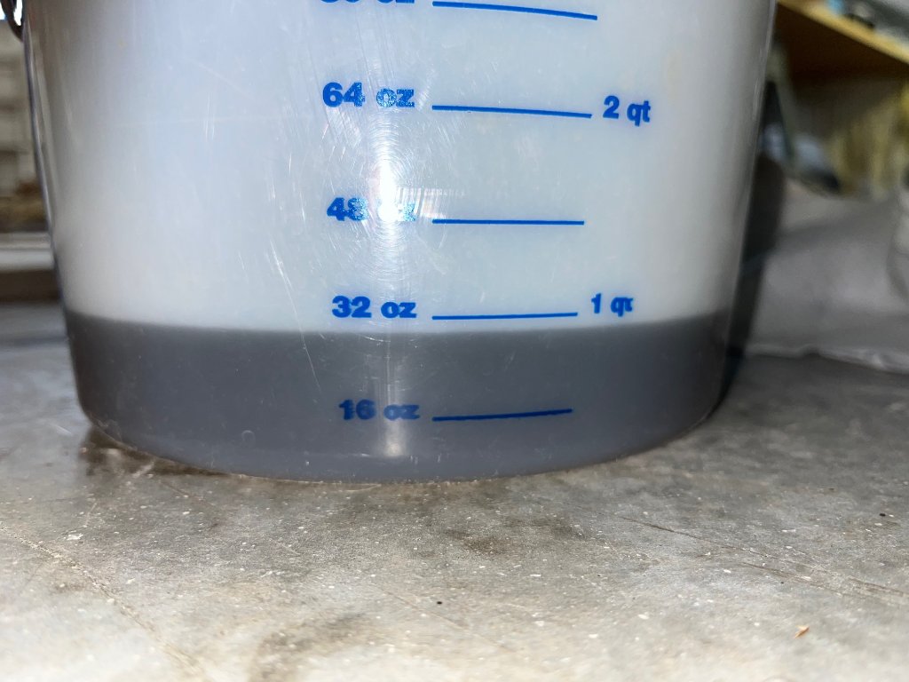 I drained the oil in three stages. First: The oil above the top petcock (30 ounces) (See photos 1 and 2). Second: The oil between the two petcocks (2 quarts, 2 ounces) (See photos 3 and 4). Third: The oil below the bottom petcock (1 quart, 13 ounces) (See photo 5).