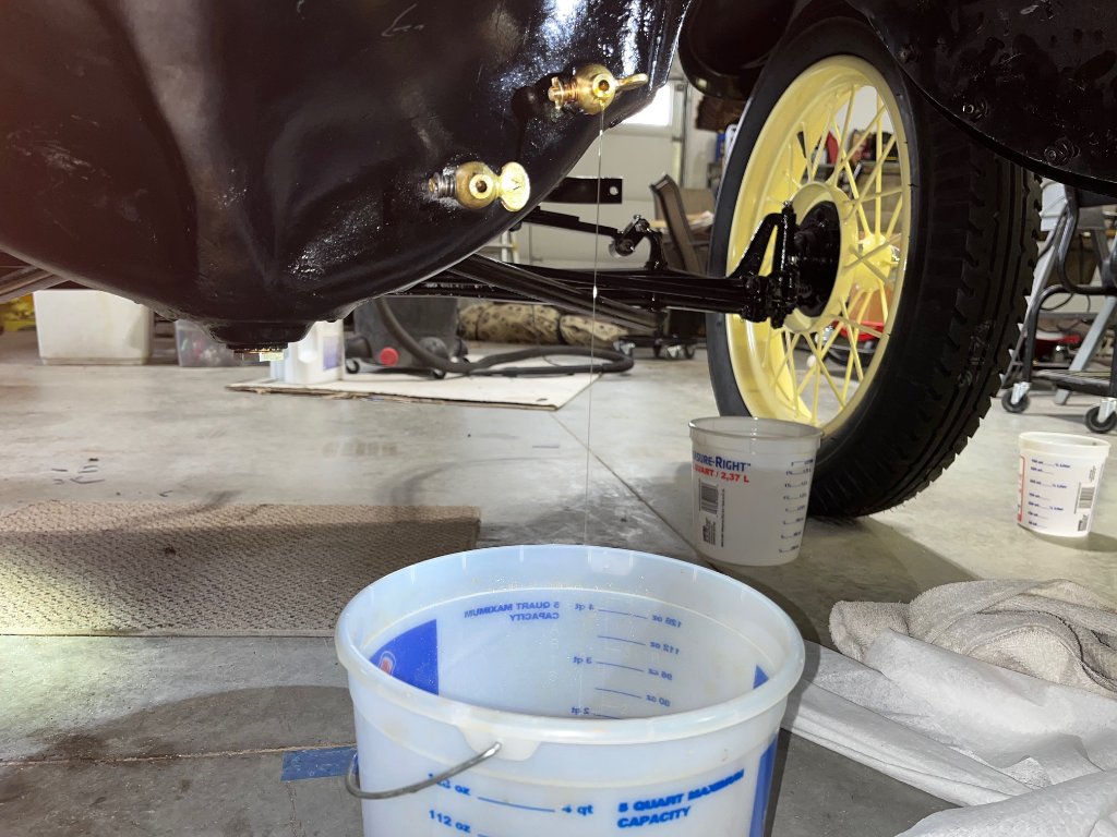 Jerry V in his May 13 (6:41am) reply raised the possibility that water maybe leaked into the oil. The block was inspected during the engine restoration so I doubted that there had been leakage. I checked the coolant level in the radiator, but I couldn't remember the level to which I filled it. Therefore, I decided to investigate by draining out the oil to determine if more came out than the 4 quarts, 23 ounces I put in.
