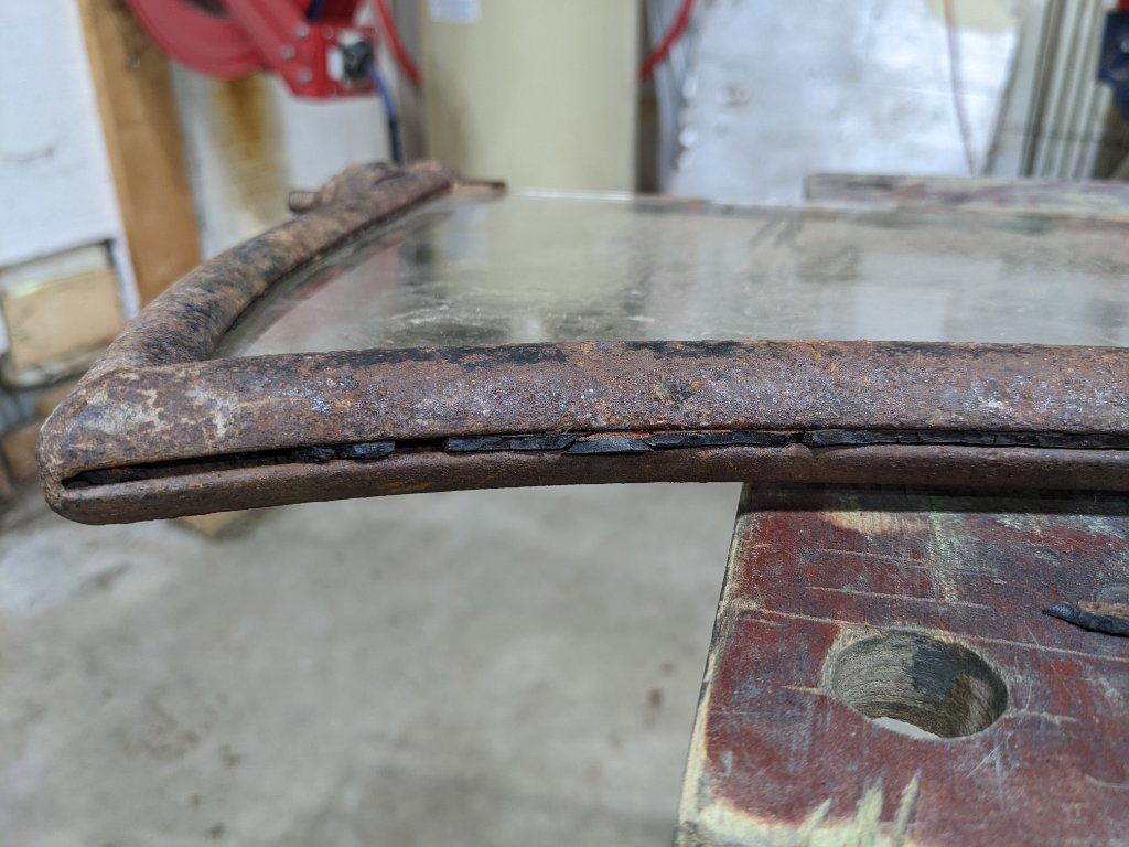 When removing the old seal, I found that inside the channel was clean, shiny metal. It took a lot of work to make the frame look like new. Now it is ready for the glass and new seal.