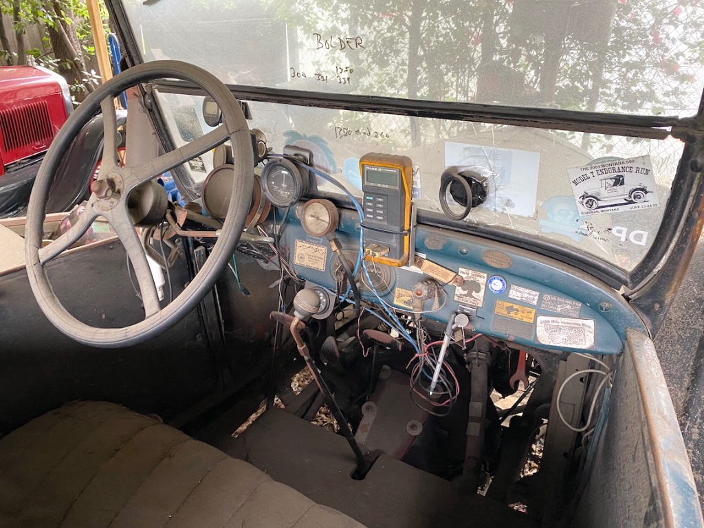 Tom is overhauling a ’26-27 steering column while Jeff Skinner monitors the action. I thought for a moment that we had stumbled into some kind of government operation: one guy working and three more supervising.