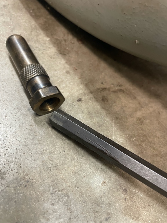 Here is same type repro cap for rubber stem tubes in brass. The insert is threaded for the valve stem, and is adjustable for depth depending on the wheel application. Once you get the insert out, it has very small splits that you can pry out just a little, and that gives resistance to backing off with the larger threads inside the repro cap. The insert uses a 3/8" hex wrench to position it back to where you want it, trial and error, but you'll want the cap to bottom out on the wheel felloe, or that insert can stick like that one did.