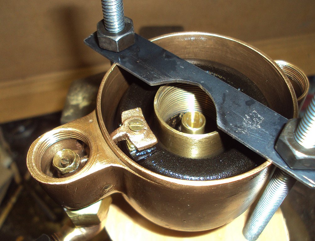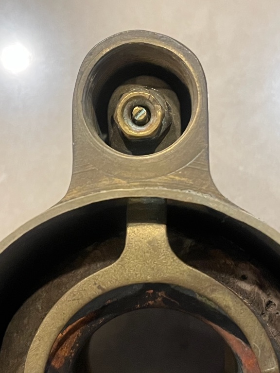 Looking at the float valve, I can see that the tickler is not letting any more gas into the chamber. Perhaps not pushing the float down. As some idiot tapped a pipe thread into the intake manifold, I can install a primer cup. I just happen to have a 90° one. It was a nice chance to clean up the brass and install it. Now I can get the extra gas needed to start without tickler or choke.