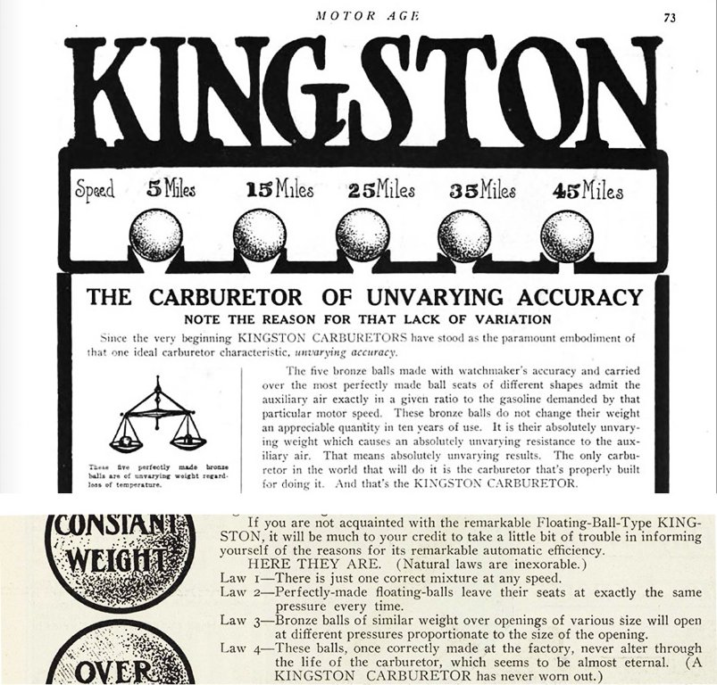 Here are some cuts from Kingston ads. The first shows different configurations for the different seats. The second has reassurance in the last line. "A KINGSTON CARBURETOR has never worn out." (Dec 23, 1909)