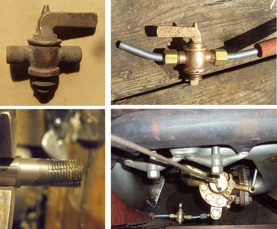 The carb had not been leaking before that but next morning there was a puddle on the floor. I concluded a shut-off valve was needed. I had bought some nice older ones. A remaining candidate did not have compression fittings. The threads for them look just like a modern size but the nuts would not go on. The diameter was just a few thousandths different and the TPI was the same so I threaded some drill rod to act as a tap. This worked fine and I installed the valve. I turned the valves on and there was no leak apparent for the rest of the day.