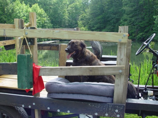 I took Griffey to the park today for a walk. 90*, but we were on a shaded trail in the woods. 1.7 miles, 28 minutes to cover it! He loves riding in Ellie Mae, wind in his face. It was not too hot on the road except for stop lights. He wouldn't drink at the park, but when we got home he went straight for the pond. I will give him his spring haircut tomorrow! I had to get him out of the pond and back into Ellie Mae for the pictures, he likes Ellie Mae but at that point he preferred the pond.