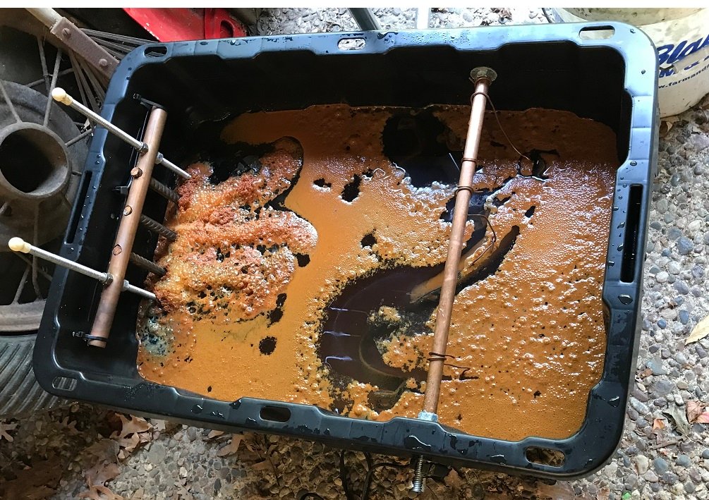 But net effect, sure is great at rust removal, safe for operator and the environment. Got the first idea to use from a visit to a hot rodder friend, who rebuilds for others too. His tank is huge plastic, and with chain falls over, can lower in large parts at a time.