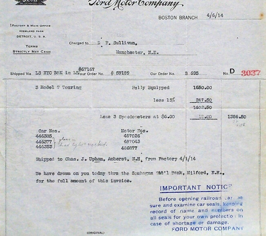 Upham received 3 tourings, after all discounts, for $1384.50. Each car was $461.50. From the factory, each car was $550. I’m not exactly sure how much over MSRP he would be able to sell each for and make money. If his market is light on cars, maybe. The factory already got its money