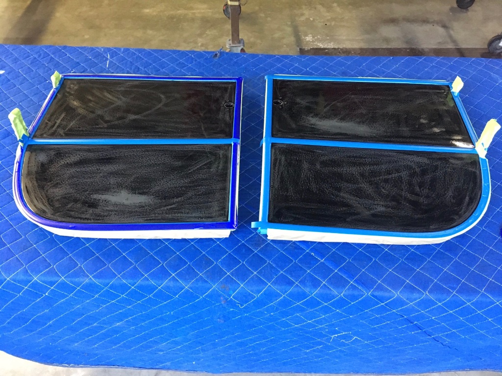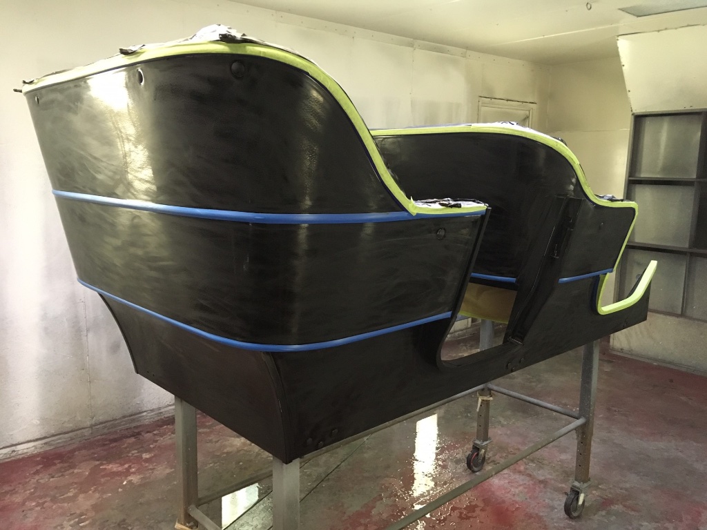 Doctored some screw ups in the paint on the body.Not a show car but plenty good for an assembled car. The upholstery had been masked off since April of last year, with layers of etching primer, fill primer, and multiple color coats. The paper and tape were brittle and fractured rather than tore when removed. No damage to the leather work and remarkably clean. So now I’m ready to brush paint all the exposed wood with black lacquer to seal it up. Still have final color on the doors, get them fit and I think the body is ready to go back on the frame. Yippee!!!