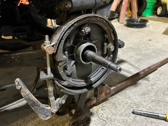When I serviced the rear axle seals and bearings I got a better look at the rear brakes. I had to pull things apart due to grease and oil on the brake pads. Both sides were a little different in how the linkage was put together. I looked around on the internet for some pictures on how the linkage should go but I didn't find any pictures that looked quite like the same brake set up.