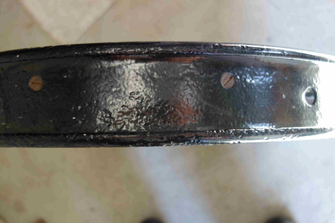 The wheels have a plywood disc which is screwed to the beaded edge rims at about 8 inch spacing. Around the outside of the disc is a metal trim which covers the edge and both sides of the plywood. The valve hole requires relieving for easy access to the valve stem. The hub center has a build up of more layers to make the hub area thicker. There is a metal disc both sides and the wheels can be detached as the wheel hubs have studs which go through holes in the hub and the wheels have nuts to hold them on, similar to normal steel rims we have had for so long. Here are some photo''s