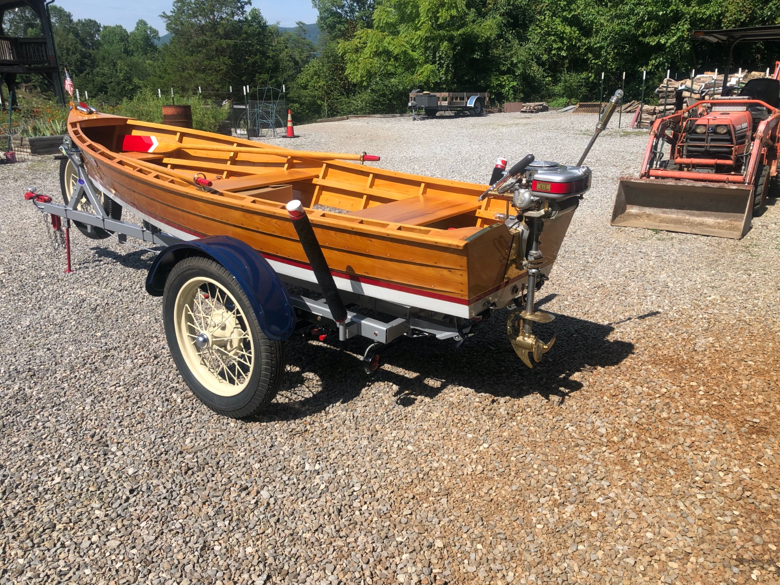 The motor is a 1926 Johnson AB-25, kinda rare as it was made for salt water and was manufactured in South Bend, IN. The factory was only there for 5 1/2 years. The boat is a William Atkinson design from the 1920's and was original 14' but my dear friend Karl Wiernert, Master Boat Builder scaled this to 12' with his added touches. It is constructed from a 200 year old White Cypress log from LA. He delivered it to me in the raw so a lot of brass work, etc. The whole thing weighs about 500 pounds.