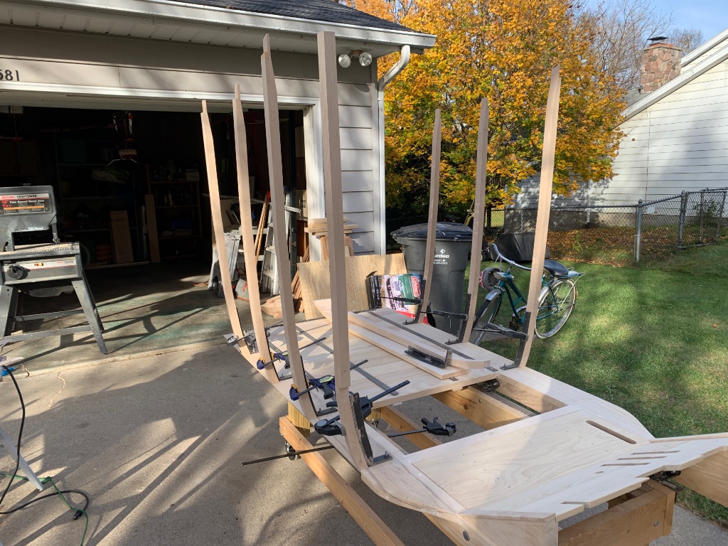 Finally got the roof rails cut out and got the top bows (9 of them) cut out and fastened. Next to finish will be the “C” sections, which will then finish the whole profile of the body. Getting closer!