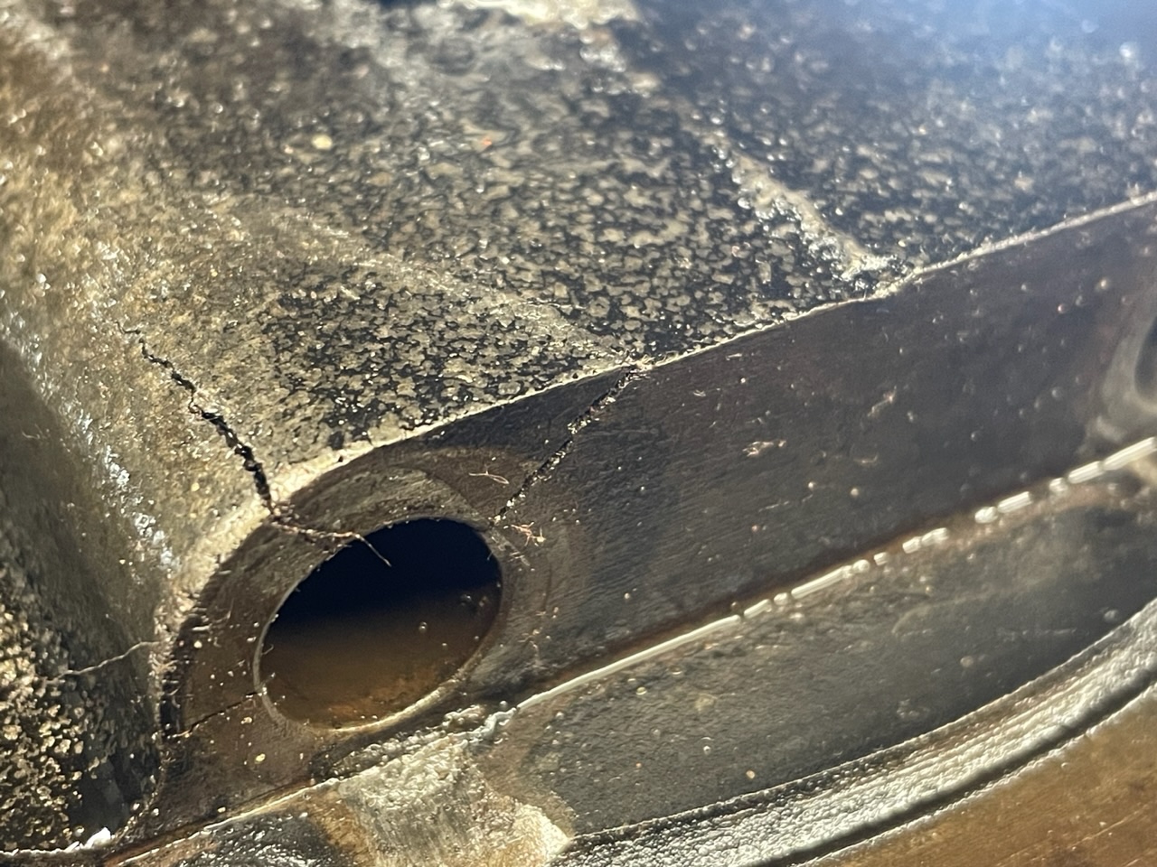 Seems someone didn’t have a main bolt installed correctly. I didn’t notice as the crack was likely full of oil sludge. I just walked away for the night, glad I don’t drink.