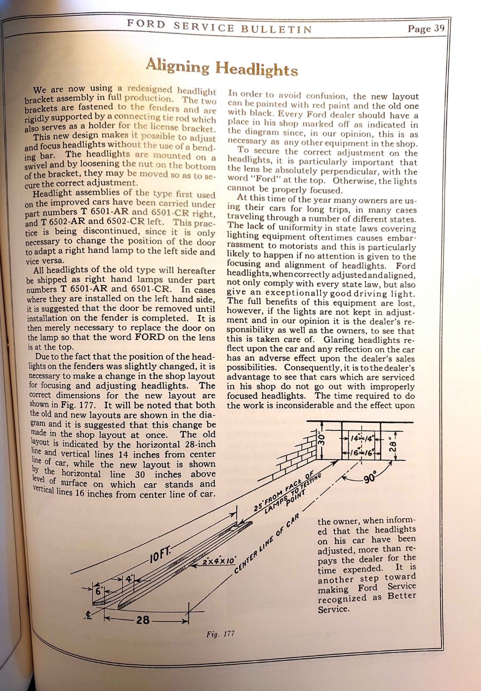 I had removed my bar mounted 26-27 headlights some time ago to repaint the buckets and never got around to properly focusing and aiming them. Marked up the garage door and driveway with chalk for the aiming points as shown in the Ford Service Bulletins and went out after dark last night to see where it has been all this time. Surprisingly the aim for one bucket was right on, and the other one was very close, but the focus was way off. Wow what a difference focusing does. A non focused beam lights up the area like a bare bulb, focusing brings the light to a round pattern then flattens it to a narrow rectangular beam. Turning the adjusting screw in and out can actually fine tune it to a 30 inch high rectangle about 4-5 ft wide. Tonight I will make a slight adjustment to the aim for one and will be back to Ford specs. No wounder I couldn't get the road to light up, and brighter bulbs were not helping. I was running 50-32 cp at one time and still couldn't see, swapping back to 32-6 cp bulbs properly focused did it. The 6 cp DIM setting will allow me to run with lights all day as driving lights without a battery discharge. I may have to try 24-4 cp bulbs for my next experiment.