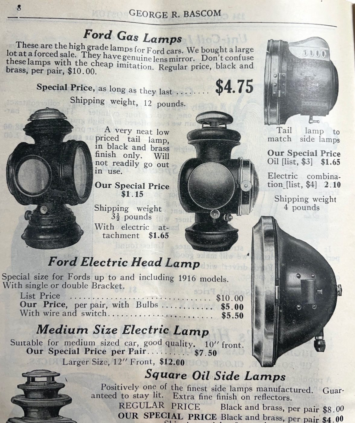 In the ad that Dan Treace posted, the "gas" "Ford" headlamps for $4.75 appear to be actual Ford closeout headlamps. After Ford finally switched to electric headlamps in 1915, a lot more people that already had earlier model Ts were updating their Fords to after-market electric lamps. Ford genuine replacement gas lamps quickly became a hard sell.