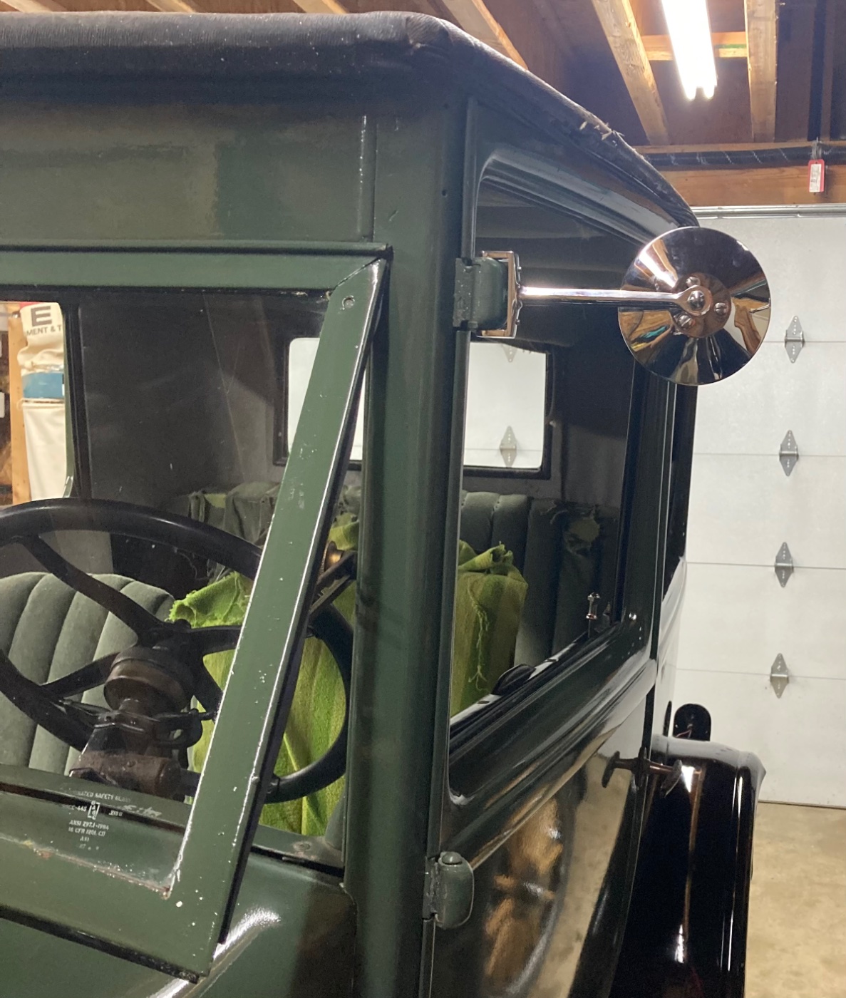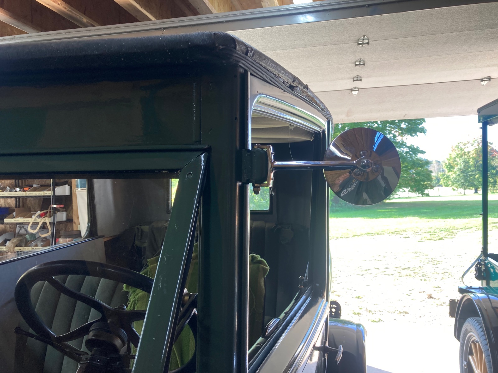 I have that mirror on my 1926 coupe, fits fine. Your hinge looks much bigger than mine.