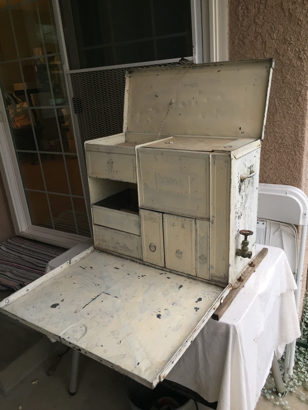 5. The photo of the front of the small kitchenette shows the letters I was able to reveal with lacquer thinner and steel wool. It is possible to read all the words except the ICE WATER tank letters. But it is reasonable to assume that is what was used on the tank as the other two sizes also used ICE WATER letters.