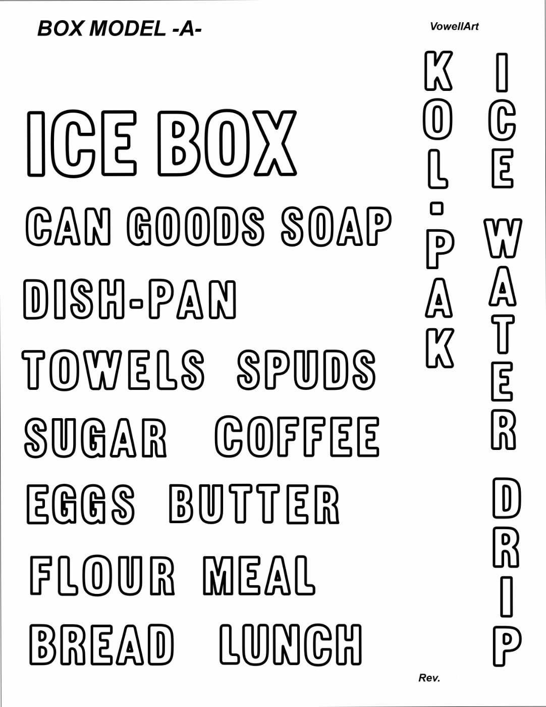 Please see attached file- credit Martynn Vowell. Perhaps we should ask Martynn to add some words found on other cabinets including: SUGAR, SOAP, SPUDS, EGGS, BUTTER, FLOUR, and MEAL. Is there anything else missing?
