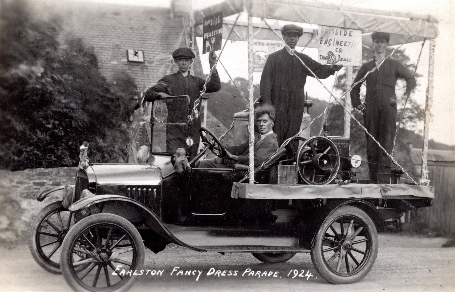 Funny picture, what strikes me as odd is that on most pictures from the era you see working men dressed in shirt and vest with neck ties and everything, but in this case they are wearing coveralls while the caption of the photo says 'fancy dress parade'