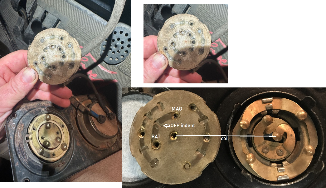 As I suspected that switch is one of the less common ones. They don't make a repro backing plate or any of the internal parts for that switch. But it is a very good one as you can see the "popular design" repro backing plate is entirely different. The "dimples" where the screw posts are should be cleaned so they make good contact when either the key or handle is rotated. I can't see any brass in those positions - can you? The other black dimples are resting spots where contacts are not to be made. Often the backing plate gets a slight warp & rubbing if across some fine sand paper is all that is needed to refresh it (but not to much). Lastly the tumbler could be cracked. I'm not in the business, but offer to repair these to help members. Will email you via the forumCouchsachraga wrote: ↑Wed Oct 18, 2023 8:16 pmThank you all for the thoughtful posts! Great community here.