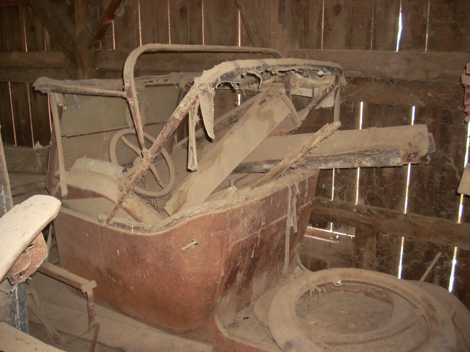 This September 1915 touring when found had 1929 CA license plates on it. it was (may still be) in a Barn of a building that was a feed store in a SMALL town in the California Sacramento Valley. We suspect it was there since 1929, but one eyewitness says when he moved into town in 1954 the building was already boarded up and NO one went inside (legitimately at least). The place is plastered with pigeon poop, about 3 to 4 inches deep! Other than the radiator and steering wheel missing, it appears to be all there. Theft, or maybe a WWII scrap drive?? The driver's side front fender is rusted away near the radiator area, as is the top panel of the hood. Can't tell you much more as there was too much poop! The body looks very square still and while I was looking it over, the guy who had "first dibs" came an I was told, "The car is sold!" Oh well, I have a December '15 touring (needing all the body wood done, etc.) so I don't REALLY need another project, but gee whiz. . . . So for $1,500 it is going to a new home, I hope the new owner succeeds in getting a valid title for it--Califunny is getting really particular about those things.